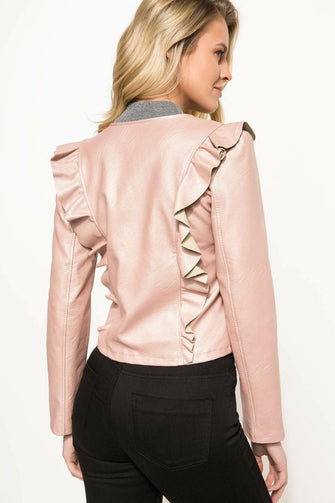 Woman Black/ Pink Short Ruffles PU Leather Jackets