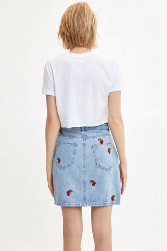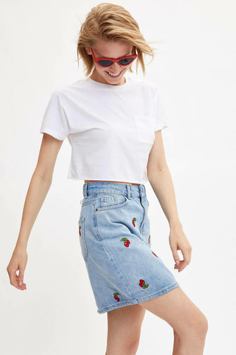 Women Summer Blue Cute Strawberry High Waist Pencil Denim Skirts
