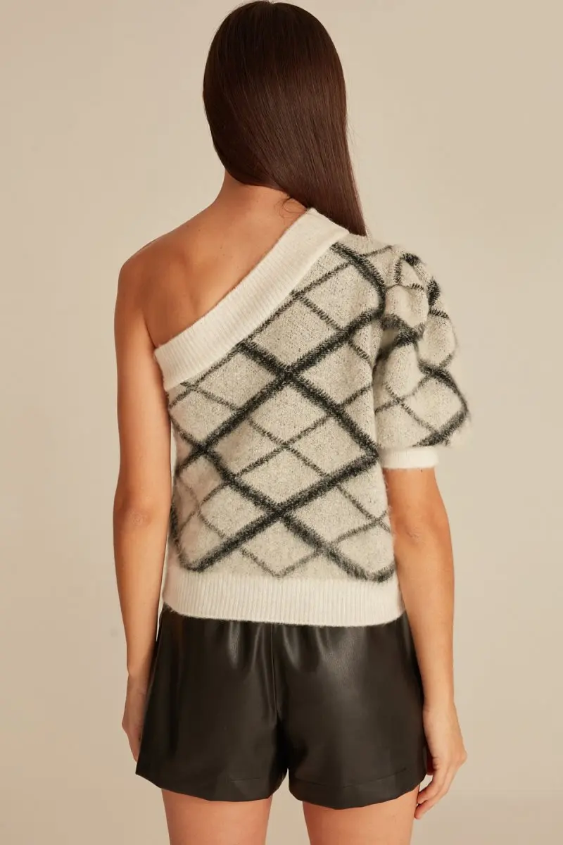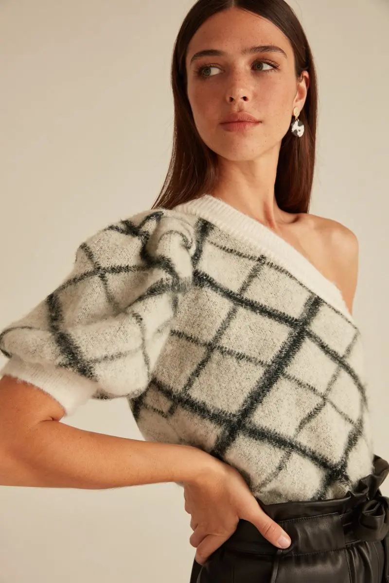 Checker Brushed Knitted Jumper With Crew Neck Ecru