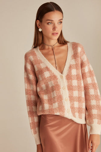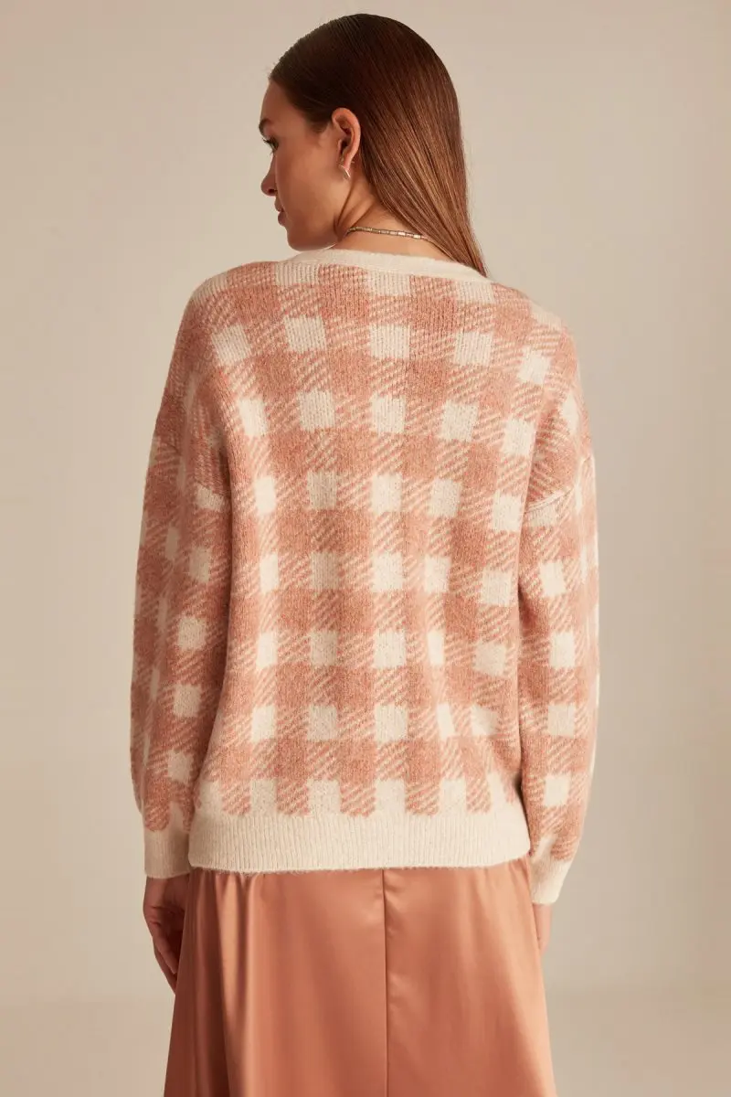 Checkerboard Knitted Cardigan With Button Detail Woman Pink