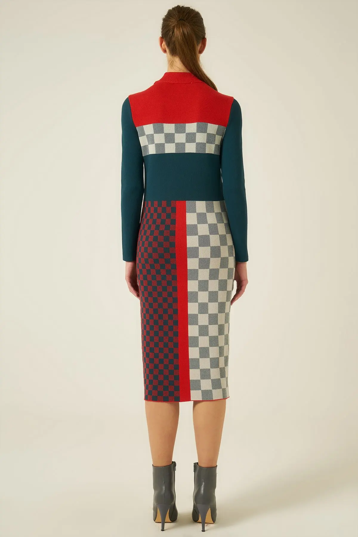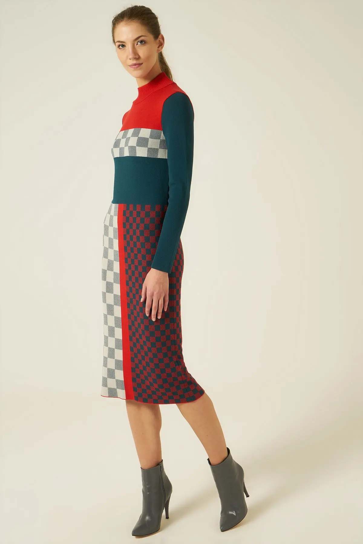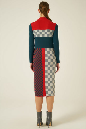 Geo Design Knitted Dress With Turtle Neck Woman Petrol Color