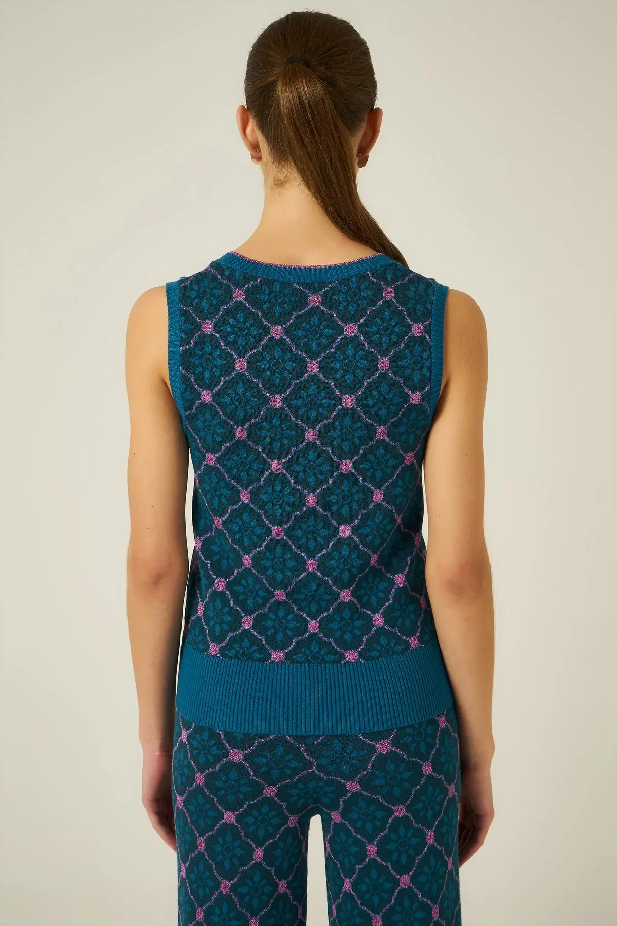 V Neck Knitted Vest Top With Geo Design Woman Petrol Color