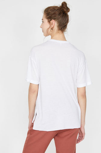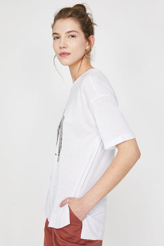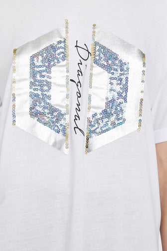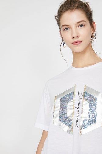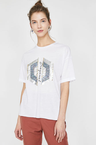 Female Ecru Bicycle Neck Short Sleeve Sequins Detail T-Shirt