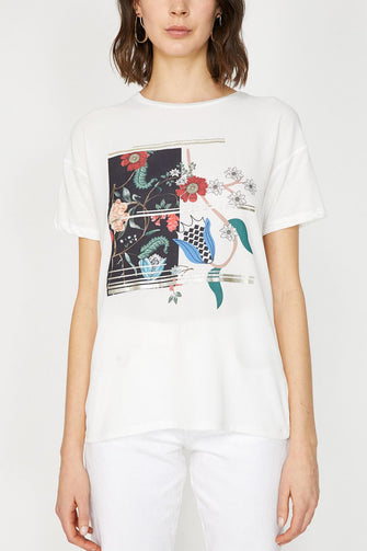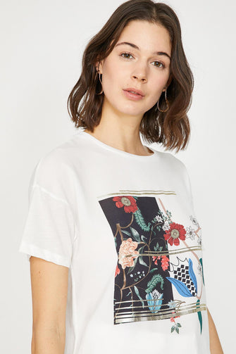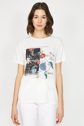 Female Ecru Bike Collar Short Sleeve Printed T-Shirt