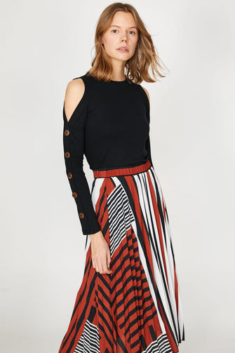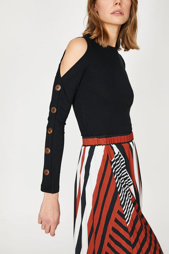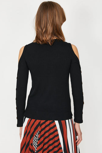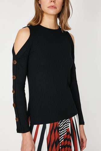 Women Black Long Sleeve Cycling Collar Button Detail T-Shirt