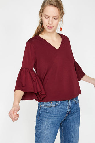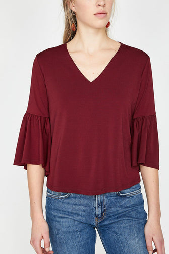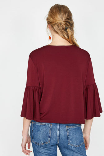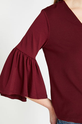 Women Burgundy V Neck Sleeve Detail T-Shirt