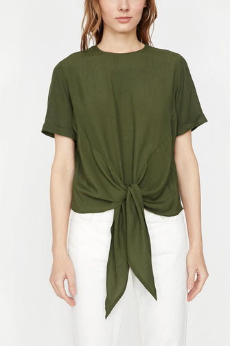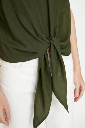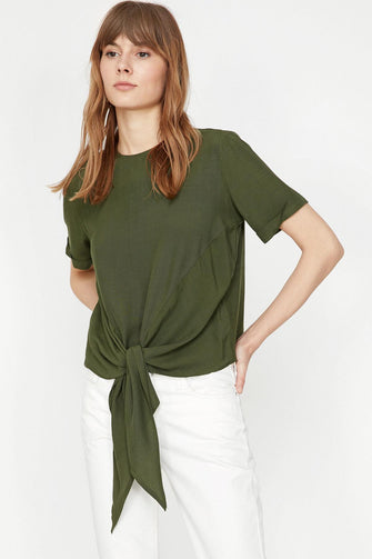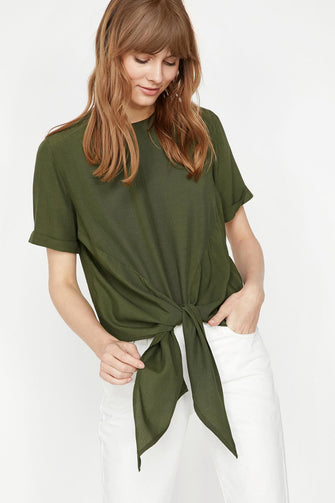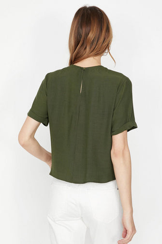 Women Green Bike Collar Short-Sleeve Lacing Bluz