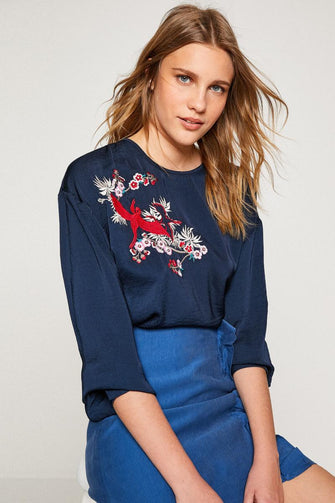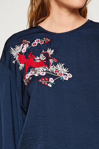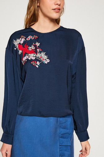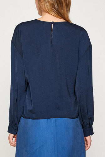 Women Navy Blue Bike Collar Long-Sleeved Blouse