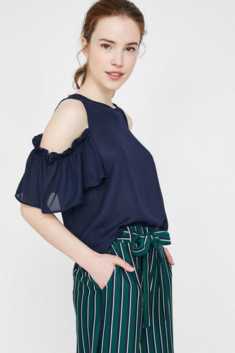 Women Navy Blue Ruffle Detail Bluz
