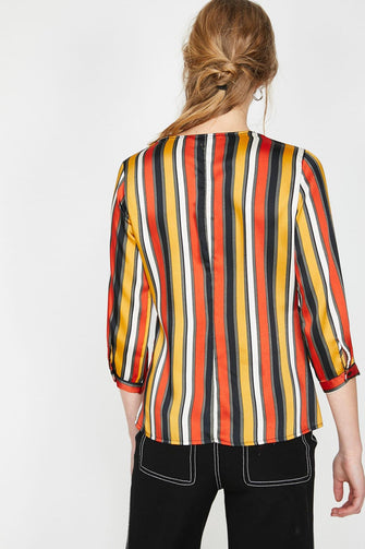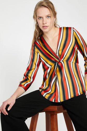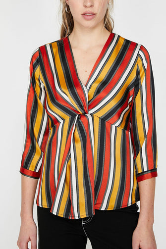 Women Orange V Neck 3/4 Sleeve Striped Blouse