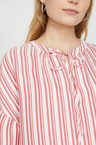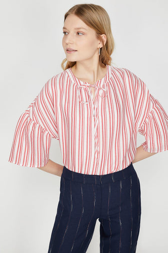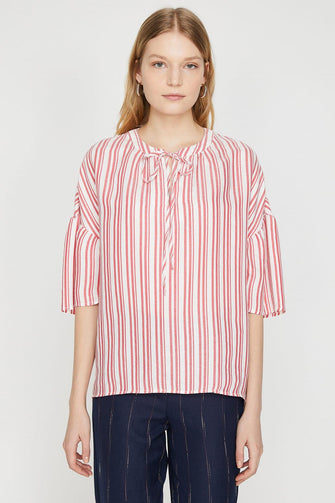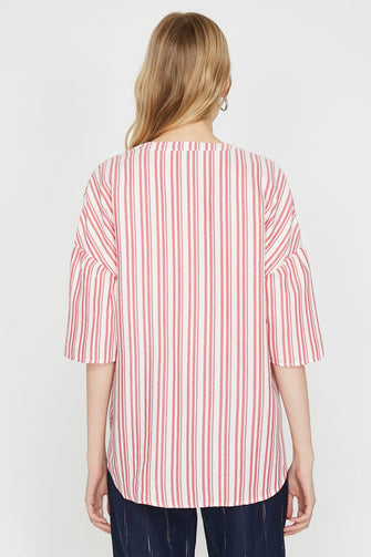 Women Red Collar Detailed Short Sleeve Striped Blouse