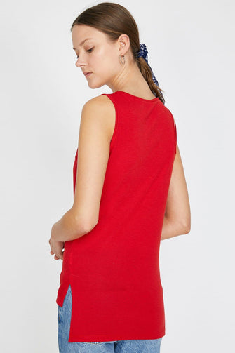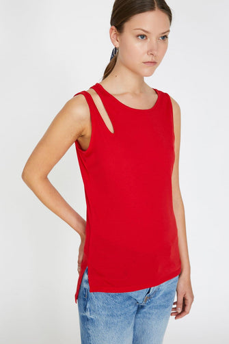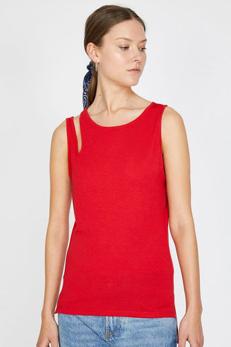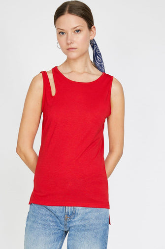Women Red Sleeveless Shoulder Detail T-Shirt