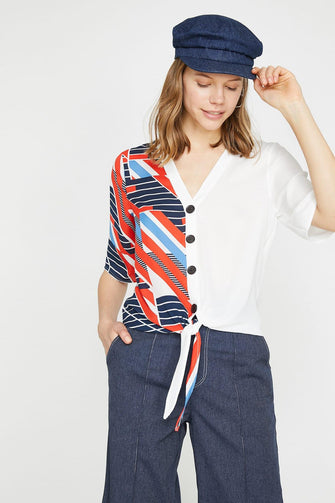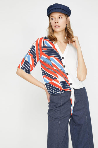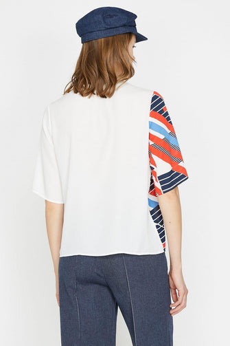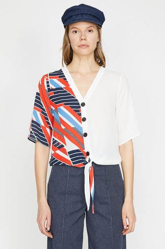 Women Red V Neck Short Sleeve Gusset Patterned Shirt