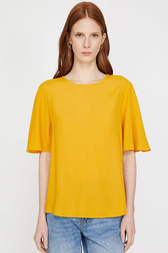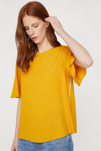 Women Yellow Bike Collar Short Sleeve Ribbon Detail Bluz