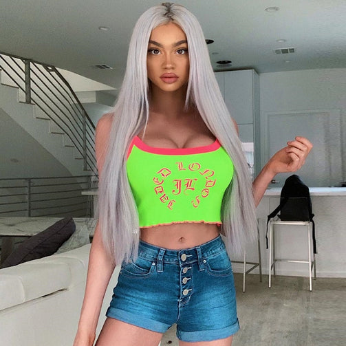 Letter Print Green Sleeveless Crop Tops