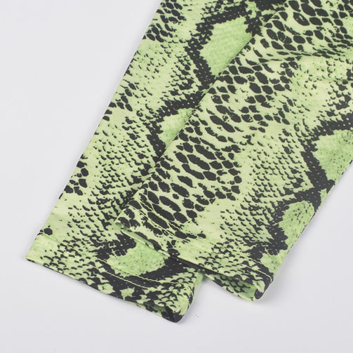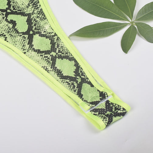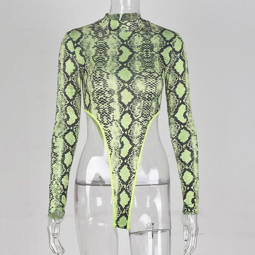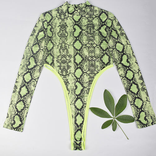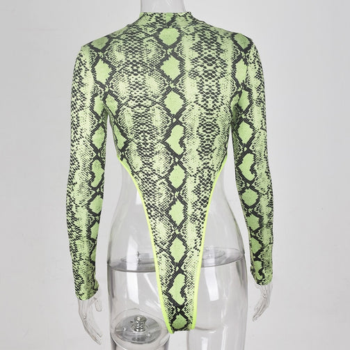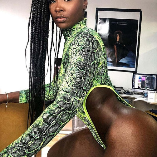 Neon Green Snake Print Sexy Turtleneck Bodysuit
