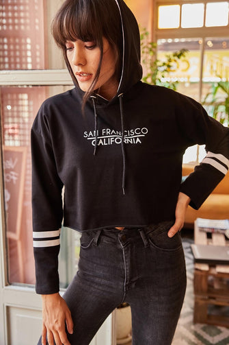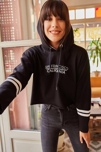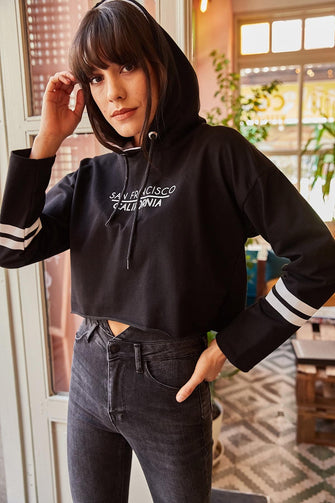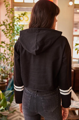 Women Black Sleeve Stripe Hooded Sweatshirt