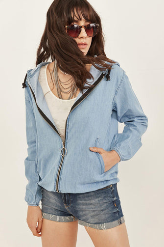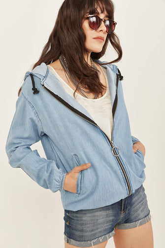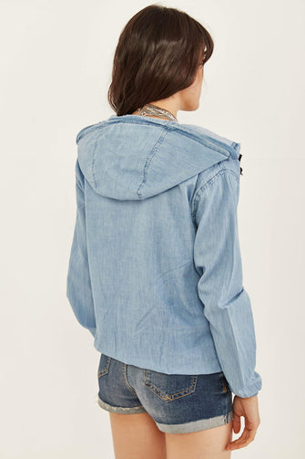 Women Blue Pockets Hooded Seasonal Slim Denim Jacket