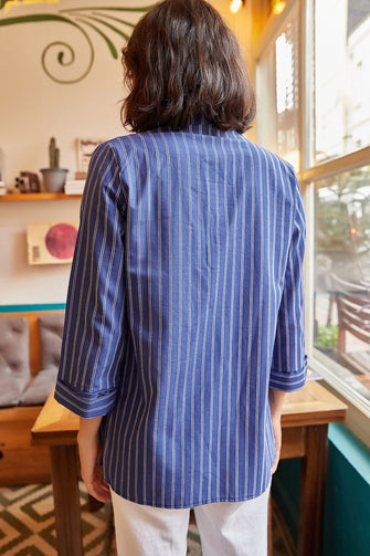 Women Blue Striped Shawl Collar Jacket