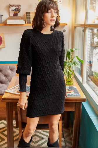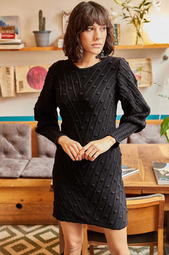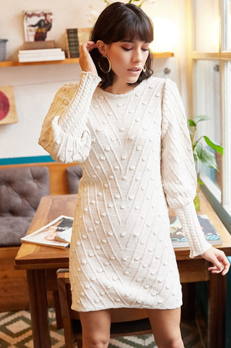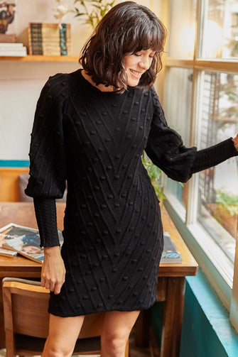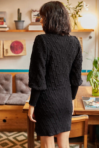 Women Tiny Pompom Balloon Sleeve Sweater Dress