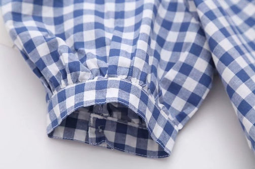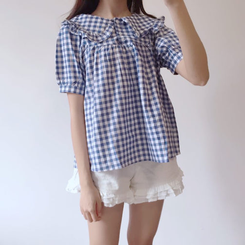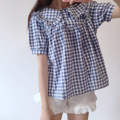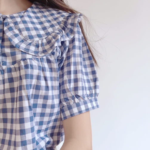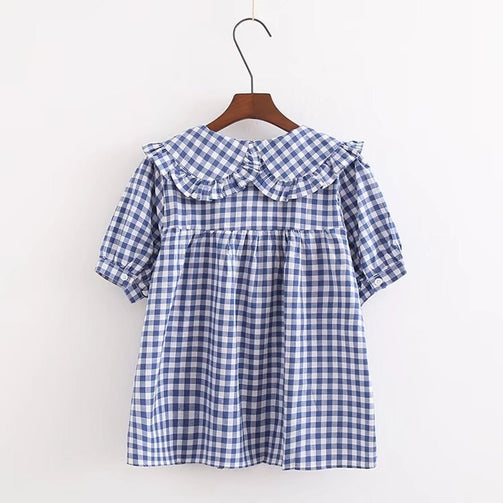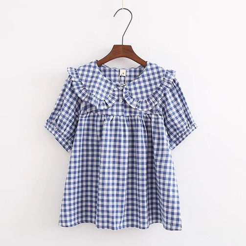 Preppy Lolita Style Women Shirts Tops Cotton Linen Peter Pan Collar Ladies Blouses Blue Plaid Printed Loose Blouses Summer New
