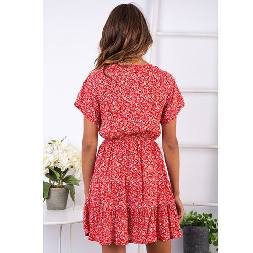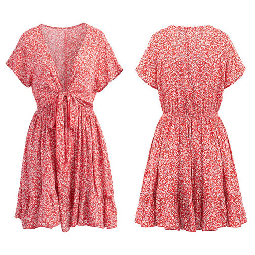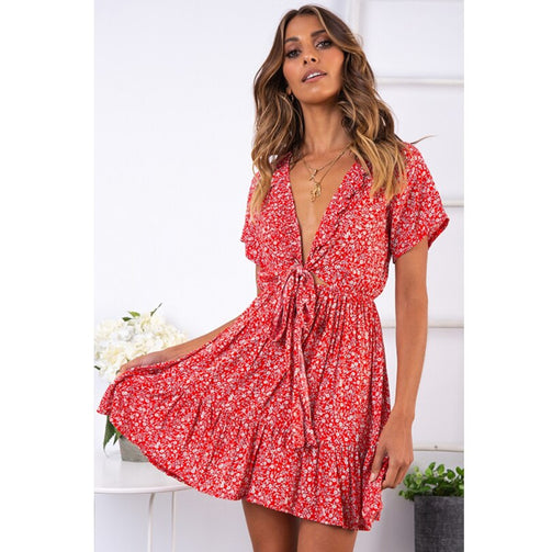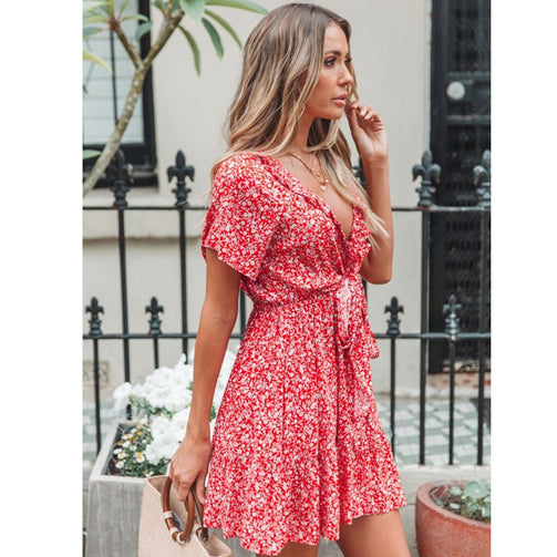 Deep V-Neck Women Short Floral Pleated Dress