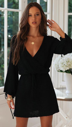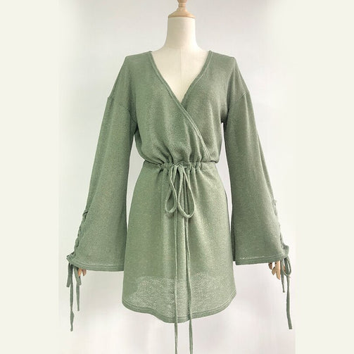 Deep V Neck Women Flare Sleeve Sashes Dress