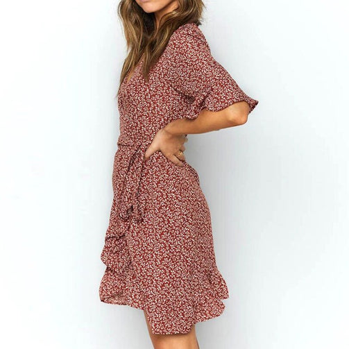 Deep V Neck Women Floral Print Ruffles Sleeve Beach Mini Dress