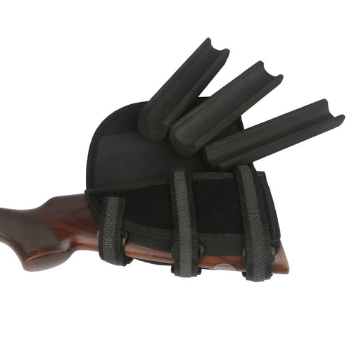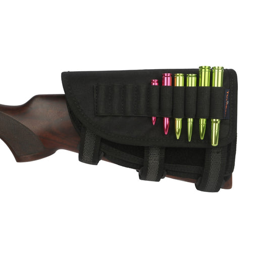 - 600D Polyester and Neoprene - 10 Round Rifle Cartridge Holder - 3 Size EVA Pad for Hunter to Adjust height - Adjustable velcro straps custom fit virtually any size stock - Use for left hand |