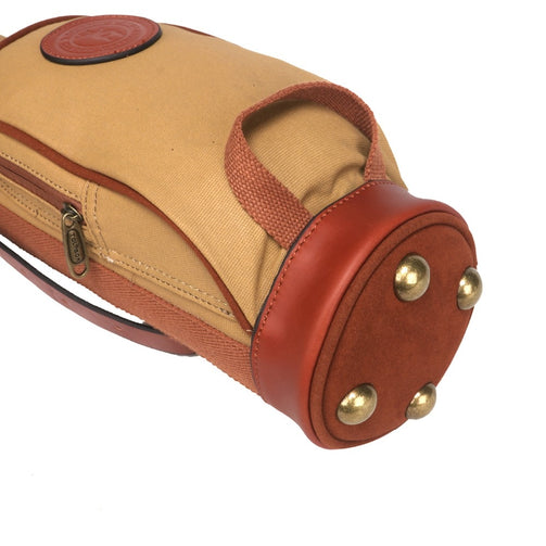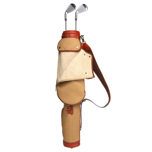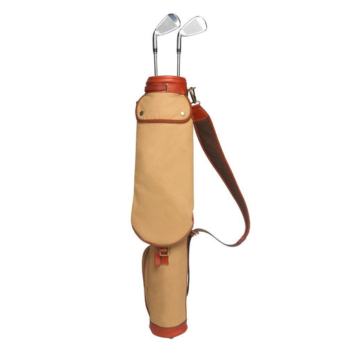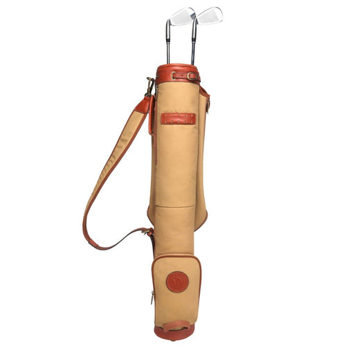 - Vintage unstructured "Pencil Bag" design with traditional features - Carries a partial set of hickory or modern golf clubs - Personalization is included on all carriers - Custom brass hardware - Large ball pocket with weather flap - Tee caddy and score card sleeve with pencil holder - Webbing divider for club separation - Umbrella holder - Bottom assist handle - Canvas & Leather adjustable sling |