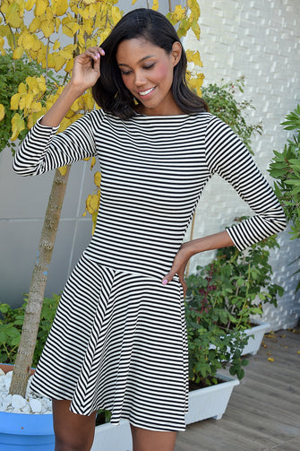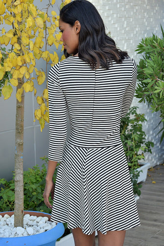Female Ecru Boat Neckline Skirt Circular Zipper Striped Dress