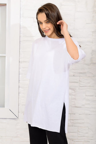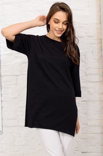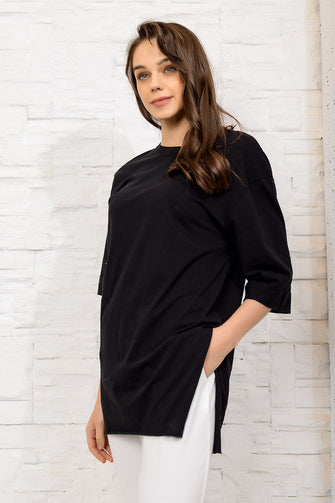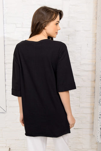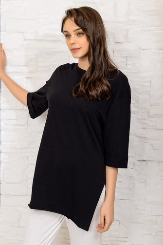 Women Black Bicycle Collar Boyfrıend Double Sleeve Slit T-Shırt
