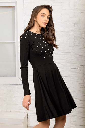 Women Black Bicycle Neck Fastening With Pearl Cloche Dress