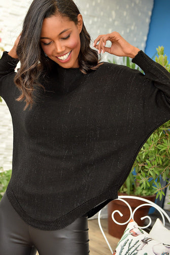 Women Black Boat Neckline Bat Silvery Sweater