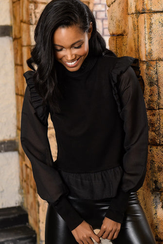 Women Black Colar And Handle Ruffle Detail Bluz