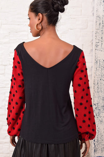 Women Black Front Back V Collar Pompom Bluz