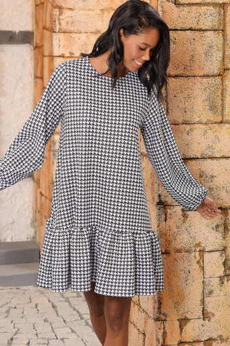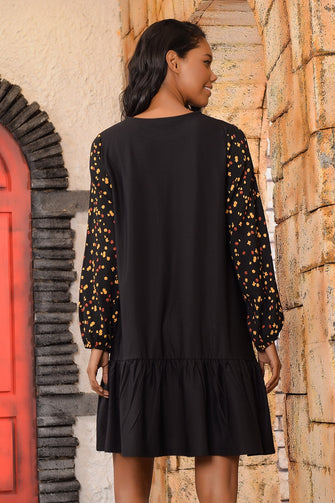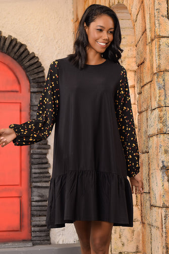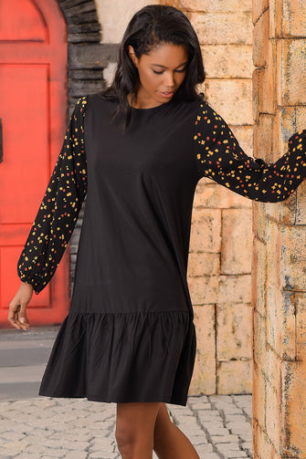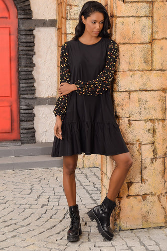 Women Black Handles Flowering Skirt Flounces Dress