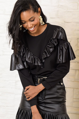 Women Black Leather Detailed Bike Collar Frilled Blouse