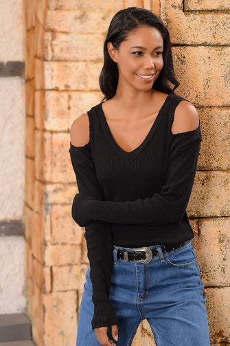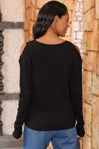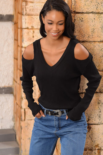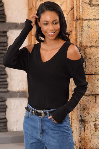 Women Black Shoulder Low-Cut Knitwear Blouse