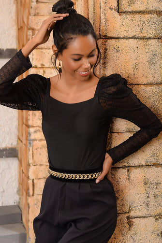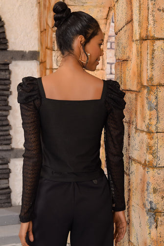 Women Black Square Collar Polka Dot Bubble Sleeve Blouse