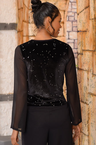 Women Black Velvet Chiffon Sleeve Double Breasted Blouse