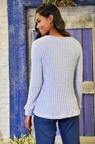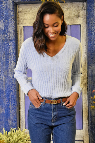Women Blue V Neck Chenille Ribbed Sweater