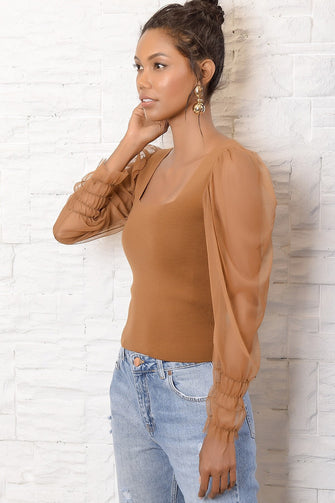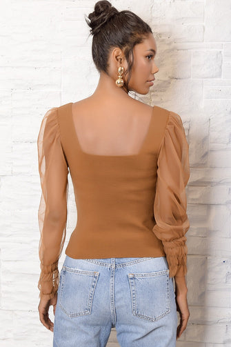 Women Cinnamon Square Collar Sleeves Gauze Sweater Blouse