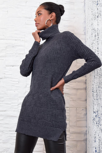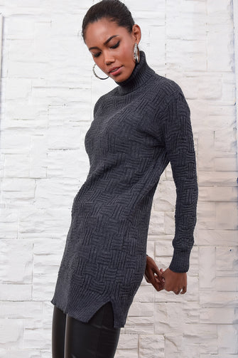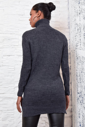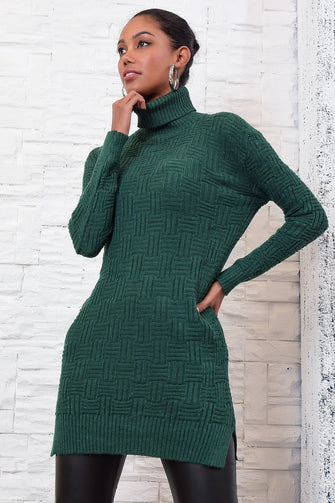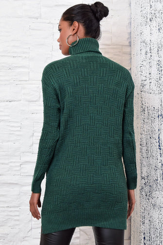 Women Green Tricot Square Pattern Turtleneck Tunic