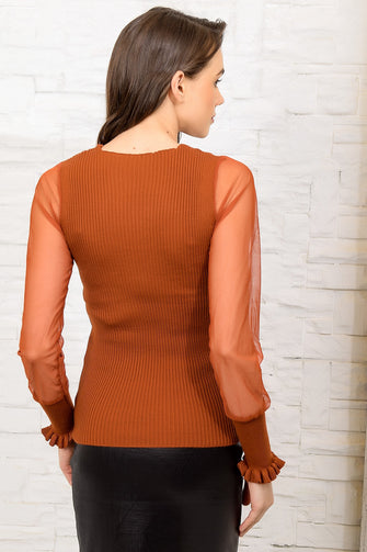 Women Gril V Collar Sleeves Tulle Detailed Bluz