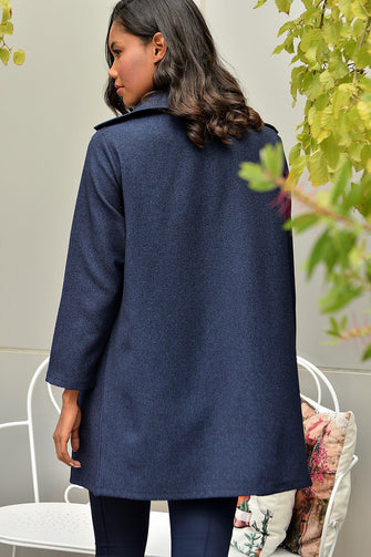 Women Navy Blue Double Pockets Cachet Knitted Coat