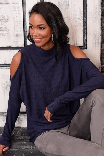 Women Navy Blue Shoulder Low-Cut Half Turtleneck Sweater