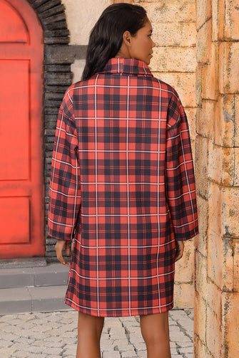 Women Red Plaid Pattern Sheer Neckline Dress