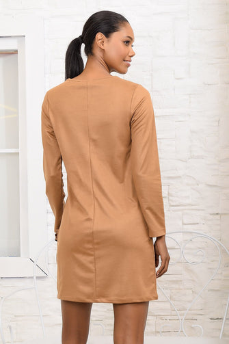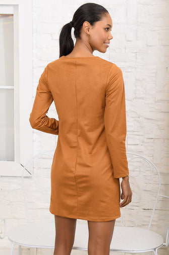 Women V-Neck Filet Lace Detailed Nubuck Dress