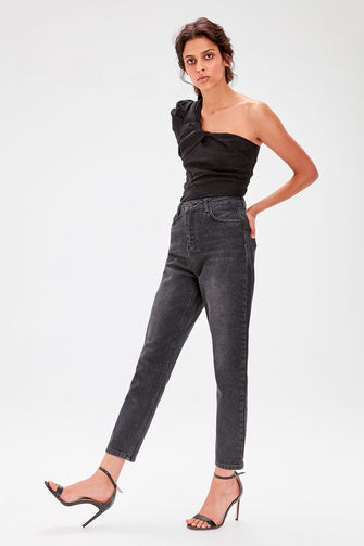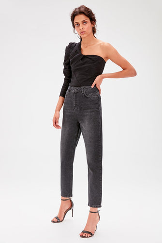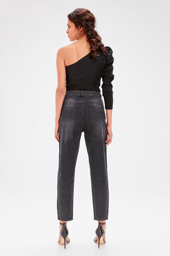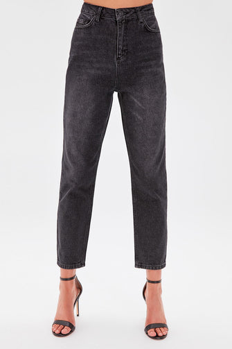 - Button and Zipper Closure, Back Flush, High Waist Mom